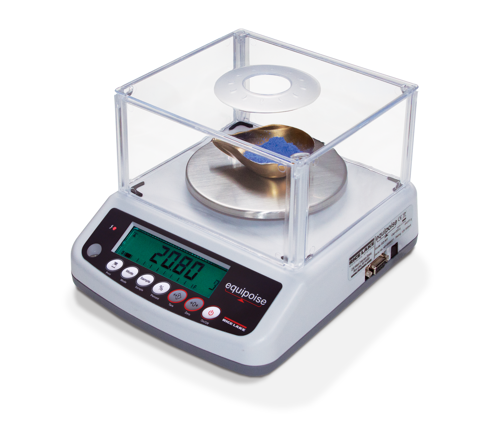 A detachable enclosed weighing chamber is included in capacities below 1,000 grams. Equipoise can be used with the included AC adaptor or an onboard rechargeable battery that offers up to 40 hours of continuous operation. RS-232 output is standard on each model. RS-232 cable is optional.